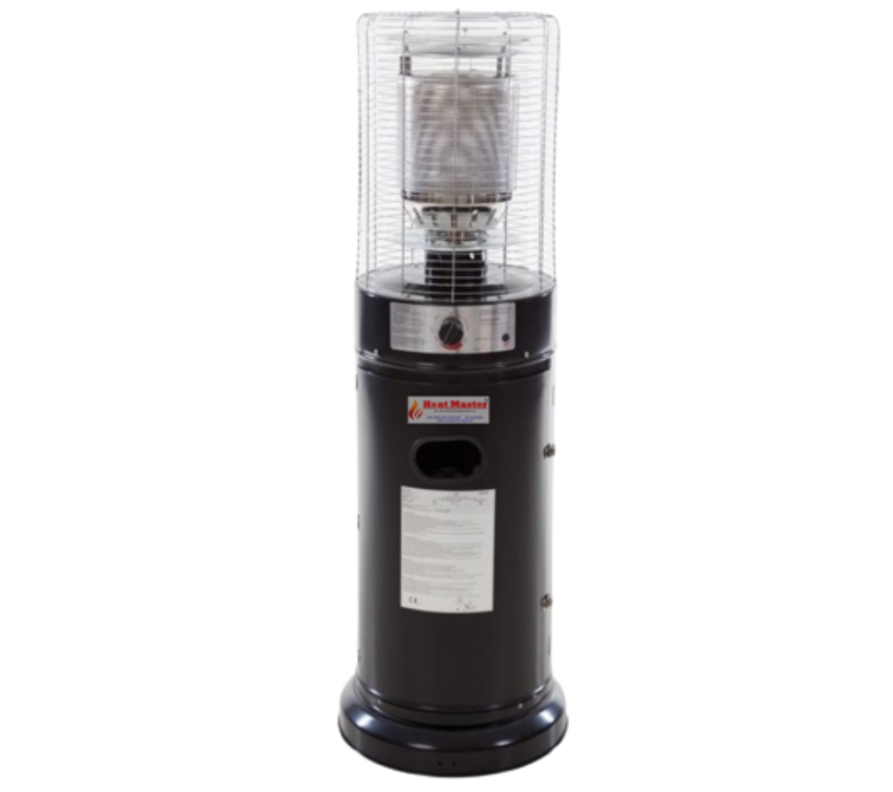 A burner on top of a pole, it burns liquefied petroleum gas (LPG), propane or butane, and directs the flames against a perforated metal screen. Heat is radiated from the surface of the screen in a circular pattern around the heater. A reflector a top the burner reflects heat that would be otherwise lost upwards. This is because the reflecting hood is usually silvered which makes it a poor absorber of heat but excellent at reflecting infra-red radiation back.